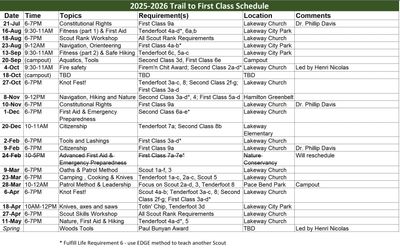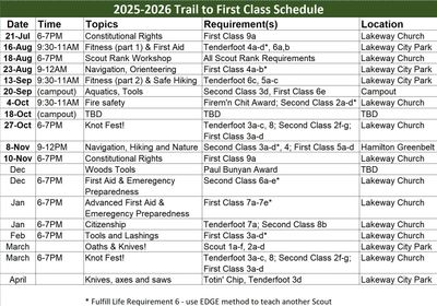 The TTFC program cover essential skills like knot tying, first aid, fire building, compass and map reading, and basic camp cooking. See schedule to the left.